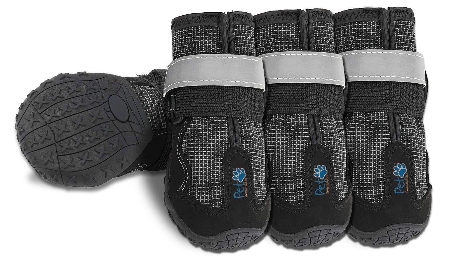 Pro: The material is well-lined and rubber sole has good grip. These do help keep the water out and paws dry. The reflective straps are a nice feature.